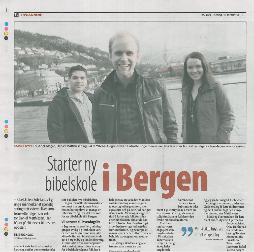 Substans se encuentra en Bergen que es la segunda ciudad más grande del país y la más importante de la región oeste. Para que puedan tener una referencia la región oeste en Noruega representa lo que la Provincia de Córdoba y sus alrededores representa para Argentina. Sin embargo, no fue hasta el 2012 que el primer instituto bíblico pentecostal de la región fue inaugurado. La necesidad para un instituto bíblico en Bergen era mas que clara durante décadas, y nos sentimos privilegiados de poder haber sido parte de la fundación de Substans.